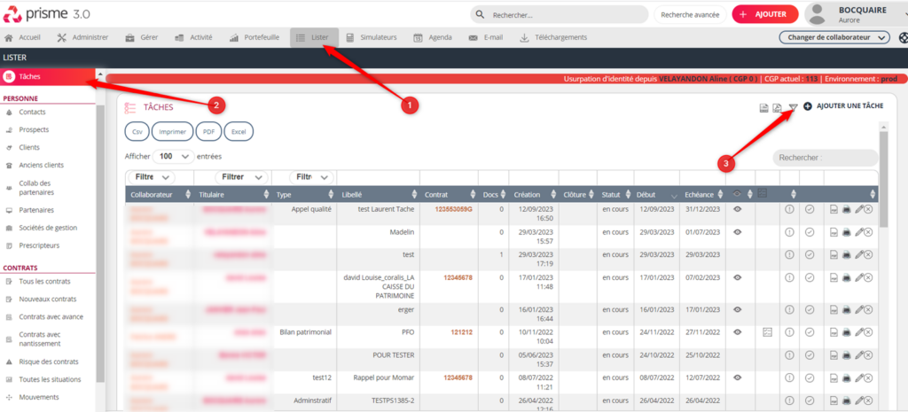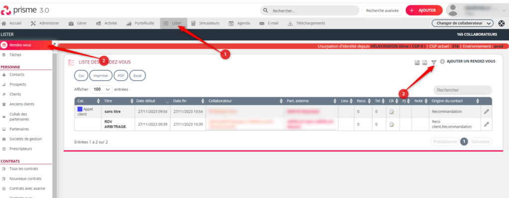 • Dans la barre de menus supérieure de Prisme, cliquez sur Lister.