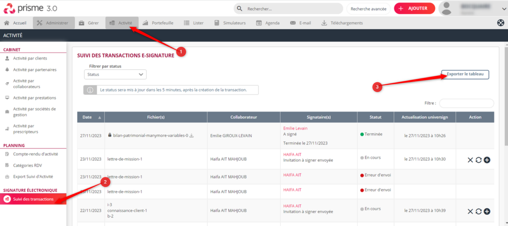 2. Dans le menu latéral à gauche, dans Signature électronique, cliquez sur Suivi des transactions.