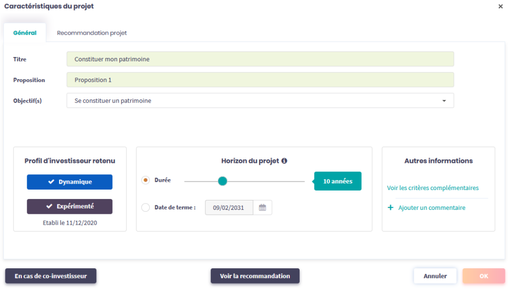Notez que les caractéristiques et comptes de la proposition d’origine sont repris ici ; si vous modifiez l’horizon du projet, et les critères complémentaires, ceux-ci sont automatiquement modifiés sur la précédente proposition. En revanche, les recommandations ou transactions réalisées dans la proposition initiale ne sont pas reprises. De même, le statut du projet passe à nouveau à « En cours de traitement ».