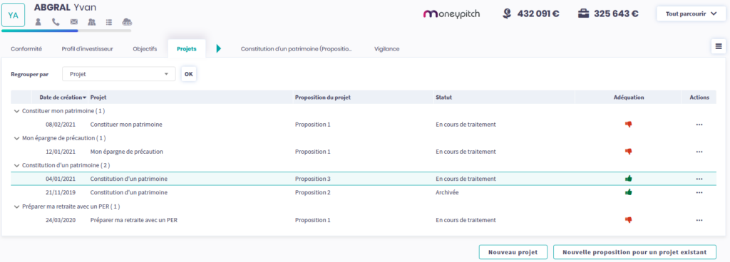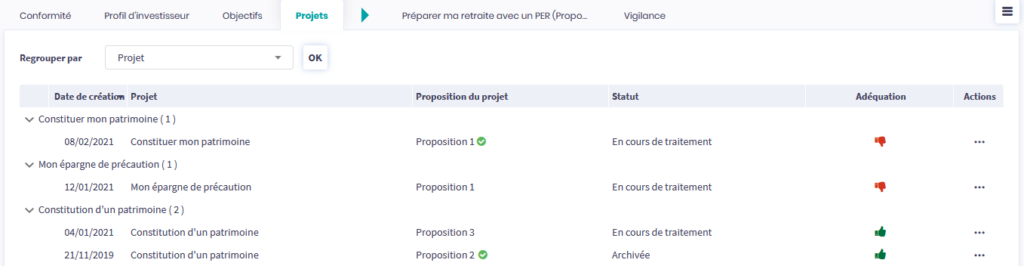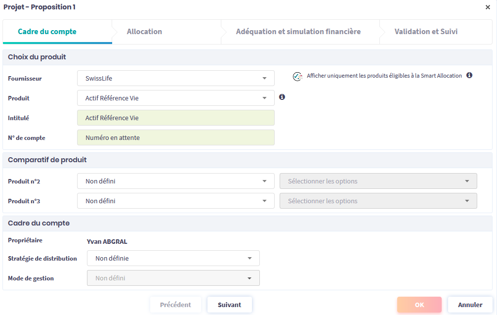 Notez que lorsque vous créez un nouveau projet, ceci constitue la proposition n°1. Nous vous conseillons de nommer la proposition judicieusement afin de bien l’identifier dans le parcours Conseil (recommandation, produit…arbitrage…).