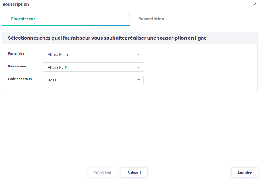 1. Sélectionnez le fournisseur Altixia Reim, votre code apporteur, puis cliquez sur Suivant.