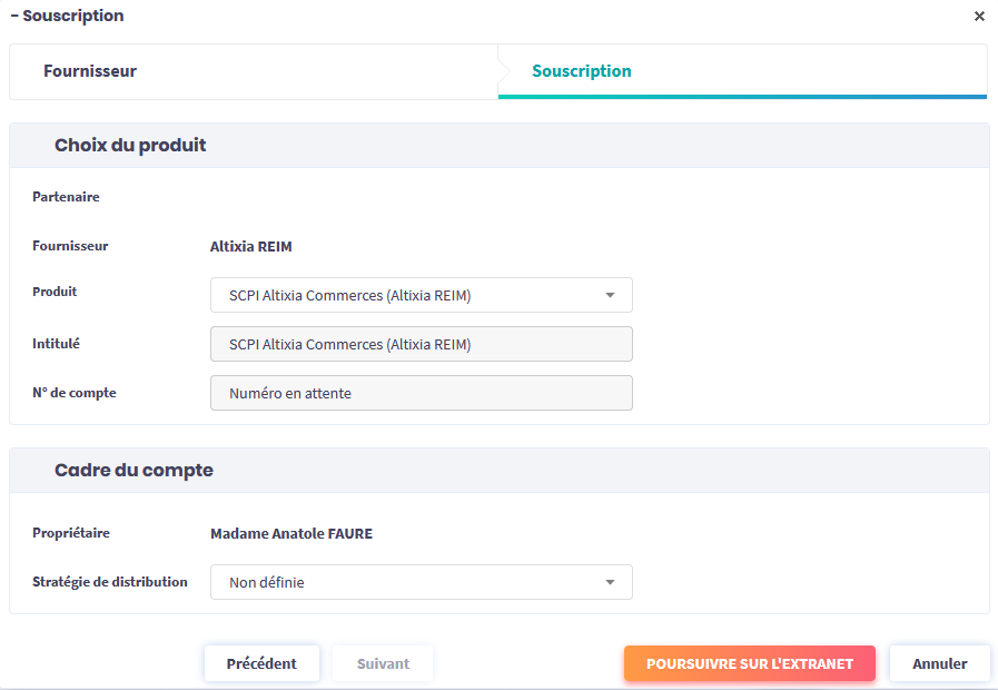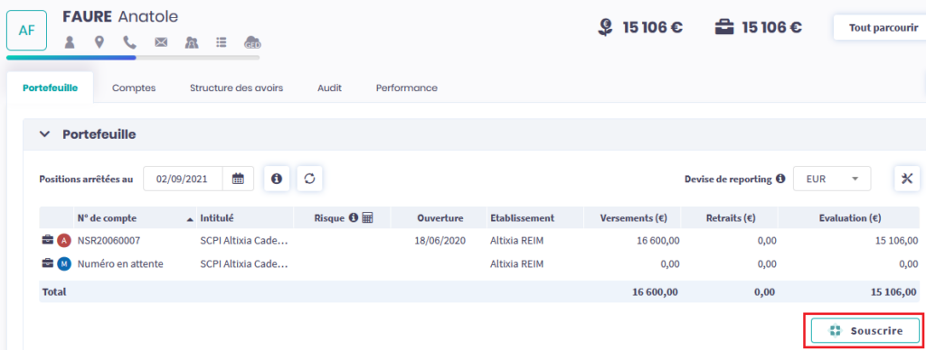 Dans O2S, vous accédez à la souscription sur l’extranet Altixia Reim depuis les portefeuilles ou les comptes de vos clients.