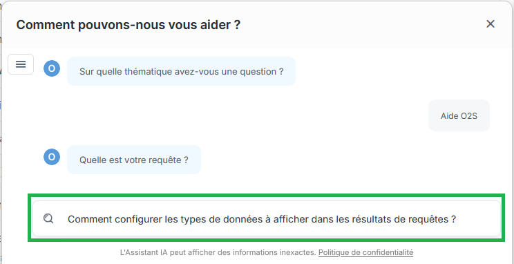 en bas à droite d’O2S, allez dans Aide IA > Aide O2S, posez votre question concernant vos requêtes, appuyez sur Entrée, et laissez-vous guider pas à pas vers une utilisation optimale !