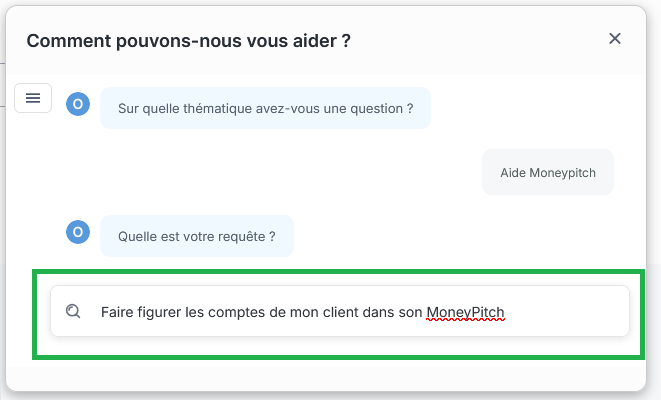 en bas à droite d’O2S, allez dans Aide IA > Aide MoneyPitch, copiez-collez un des titres en gras ci-dessous dans la zone « Quelle est votre question », appuyez sur Entrée, et laissez-vous guider pas à pas vers une utilisation optimale !