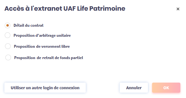Si vous disposez de plusieurs logins UAF LIFE Patrimoine, vous devez utiliser celui qui vous permet habituellement de visualiser le contrat sur l’extranet UAF LIFE Patrimoine.