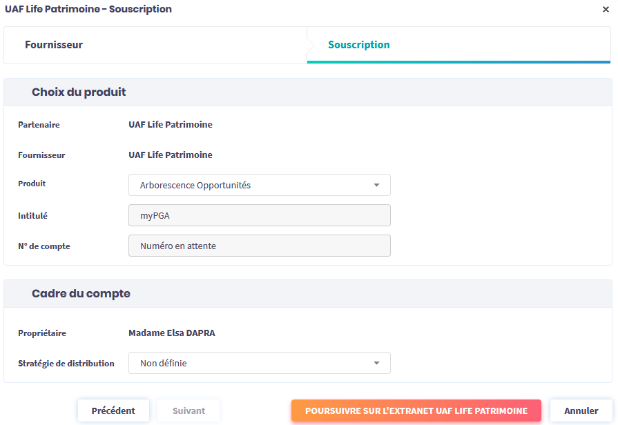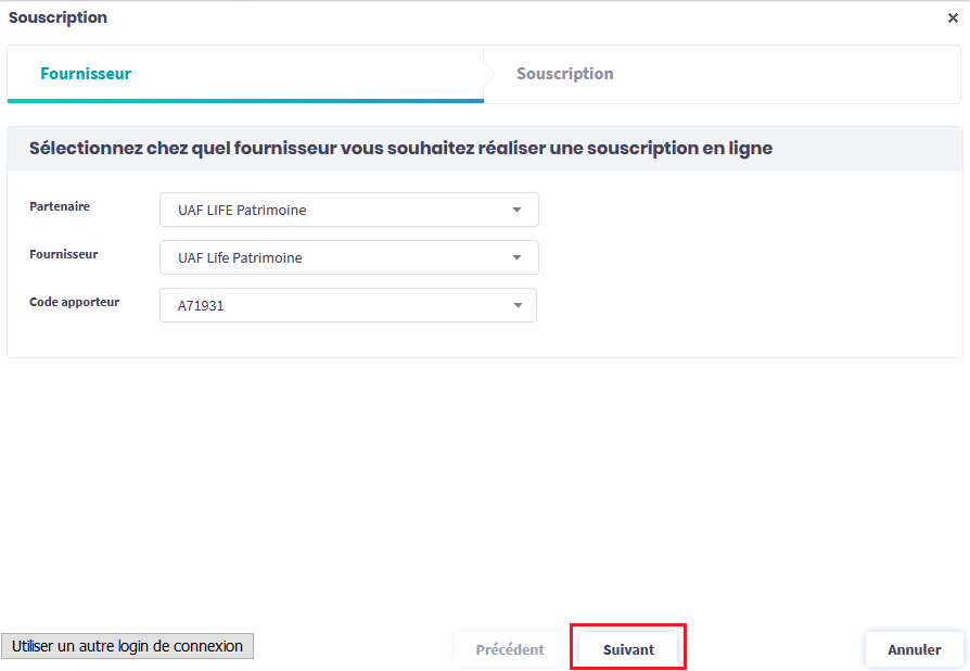 - Sélectionnez le fournisseur UAF Life Patrimoine, votre code apporteur, puis cliquez sur Suivant.