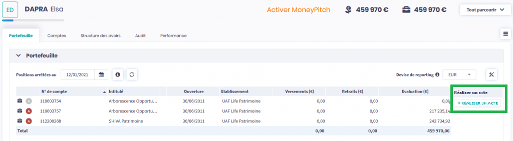 - Dans O2S, allez dans le module Contacts > Portefeuille afin d’afficher le compte UAF LIFE Patrimoine auquel vous souhaitez accéder.