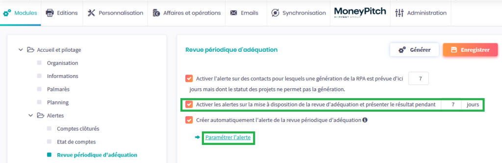 Suite à l’interruption du 27 février dernier, les projets soumis à la revue périodique d’adéquation (RPA) peuvent présenter des données obsolètes. Par mesure de précaution, les revues configurées en « envoi automatique » ne sont pas envoyées automatiquement, mais sont générées de manière unitaire, pour vous permettre de valider l’adéquation avant de décider de les envoyer à vos clients.