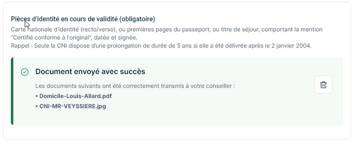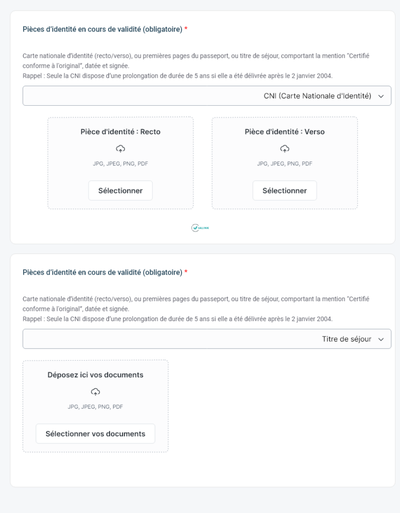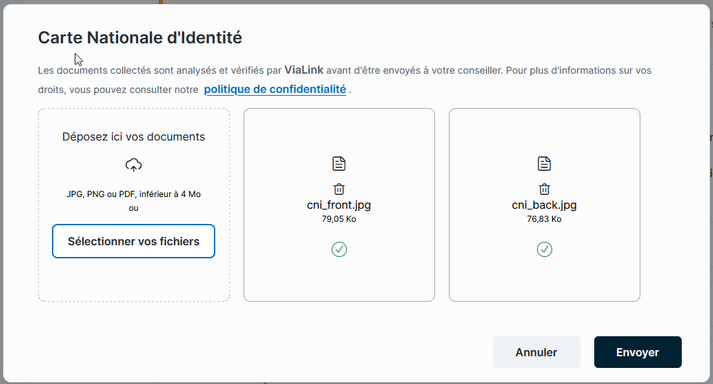 Dans les écrans Identité et Justificatif de domicile de son formulaire KYC, votre client a la possibilité de charger des documents vérifiables par Document Recognition ; il doit alors sélectionner ce document sur son poste de travail et le soumettre à Document Recognition (ou le faire glisser sur la zone en pointillés) .
