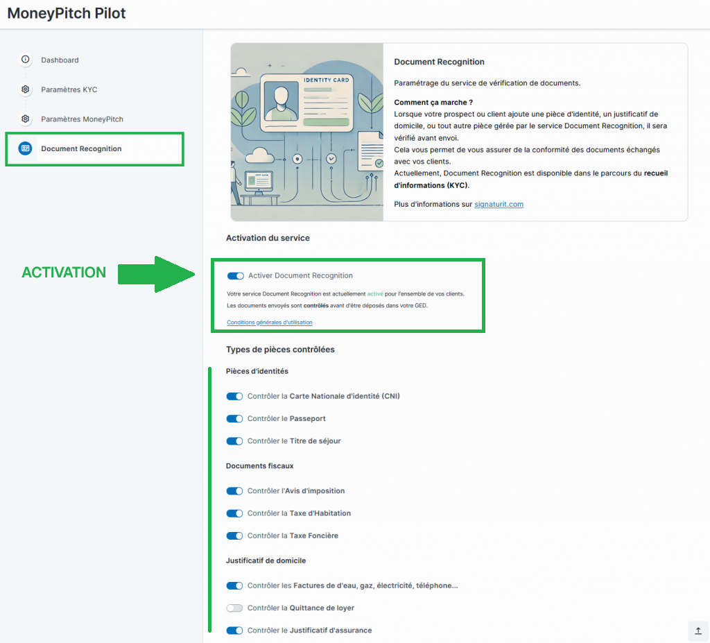 - Activez Document Recognition pour l’ensemble de vos clients, à l’aide du bouton switch dédié.