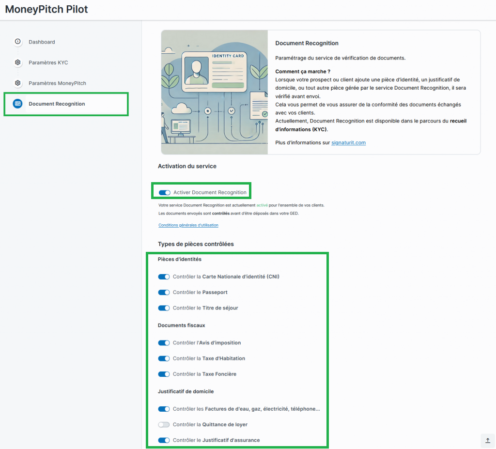 - Activez le service Document Recognition pour l’ensemble de vos clients, à l’aide du bouton switch dédié.