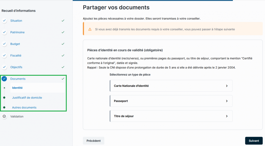 A l’étape « Documents » de leur parcours KYC, dans les écrans Identité, Justificatif de domicile et Autres documents, de son formulaire KYC, votre client a la possibilité de charger des documents vérifiables par Document Recognition.