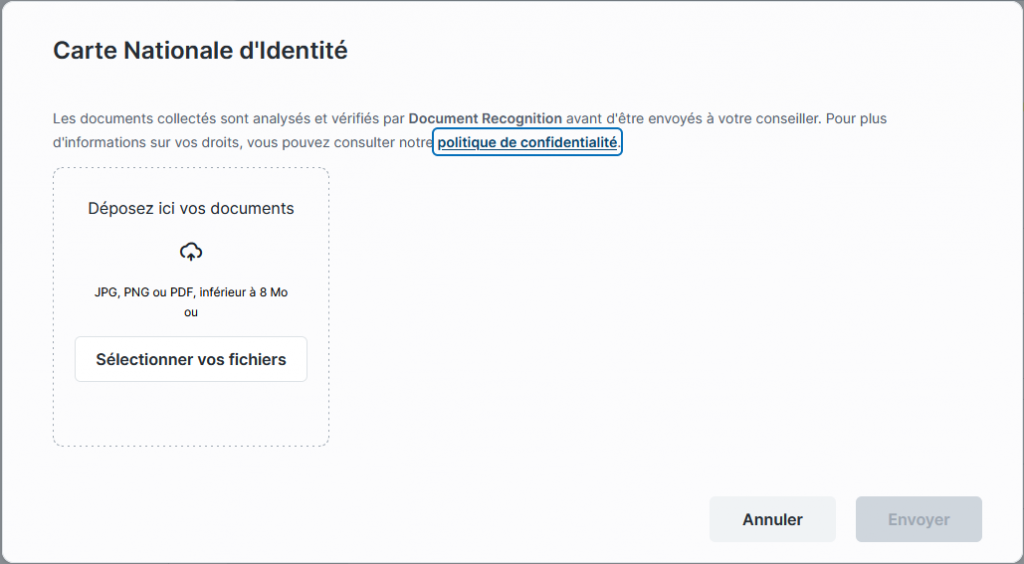 Il doit alors sélectionner ce document sur son poste de travail (ou le faire glisser sur la zone en pointillés) et le soumettre à Document Recognition. Puis il clique sur Envoyer.